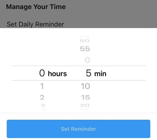 اگر عبارت Set Daily Reminder را لمس کنید، صفحه زیر برای شما نمایش داده میشود و میتوانید میزان استفاده از اینستاگرام را با ساعت و دقیقه مشخص کنید. با این کار، زمانی که میزان استفاده شما از این اپلیکیشن بیشتر از زمان تعیین شده شود، یک پیام هشدار دریافت میکنید.