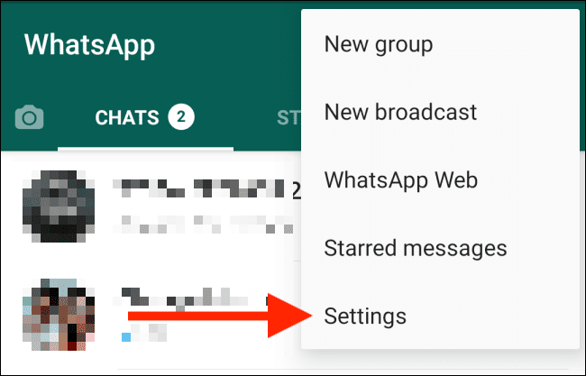برای اینکه بتوانید این قابلیت واتساپ را محدود کنید ابتدا باید آخرین نسخه اپلیکیشن واتساپ را از گوگل پلی استور یا فروشگاه‌های دیگر دانلود و نصب کنید. بعد از اتمام نصب، واتساپ خود را باز کنید و روی سه نقطه گوشه بالا و سمت راست صفحه ضربه بزنید.