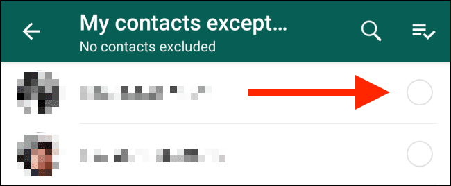 با انتخاب گزینه My contacts Except صفحه جدیدی برای شما باز می‌شود و باید نام افراد موردنظر خود را از لیست مخاطبانتان انتخاب کنید.