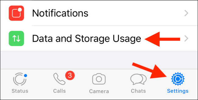 فرآیند انجام این کار در گوشیهای ایفون کمی متفاوت است. اپلیکیشن واتساپ را باز کنید و وارد تنظیمات شوید. برای ورود به تنظیمات باید روی تب Setting در پایین صفحه ضربه بزنید. در صفحه ای که برایتان باز می شود وارد بخش Data and Storage Usage شوید.