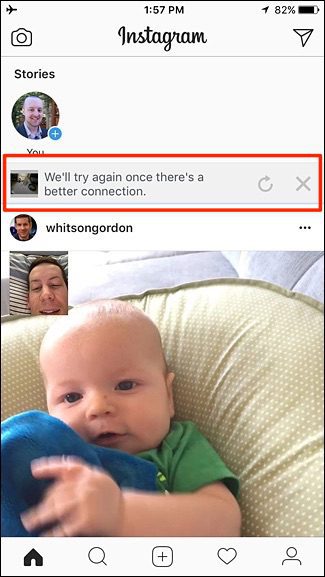 قطعا در این حالت عکس شما با موفقیت پست نمیشود. پیامی روی صفحه home اینستاگرام نمایش داده میشود که میگوید «We’ll try again once there’s a better connection».