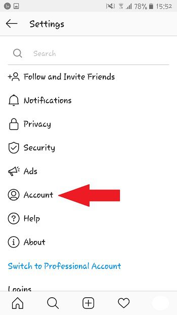 سپس در صفحه تنظیمات روی گزینه Account ضربه بزنید.