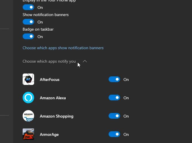 برای اینکه همه نوتیفیکیشنهای روی گوشی برای شما نمایش داده شود روی گزینه Customize کلیک کنید. برای مثال اگر میخواهید نوتیفیکیشنها در هنگام کار کردن شما روی گوشی ظاهر نشوند در صفحه باز شده گزینه Display in the Your Phone app را غیر فعال کنید. یا میتوانید گزینه Show Notification Banner را غیر فعال کنید.
