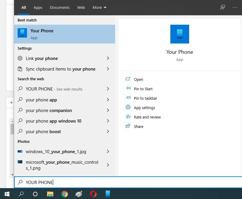 بعد از باز شدن این منو، عبارت Your Phone را تایپ کنید و اپلیکیشن نمایش داده شده را باز کنید. برای باز کردن آن، روی عبارت Open سمت راست صفحه کلیک کنید.