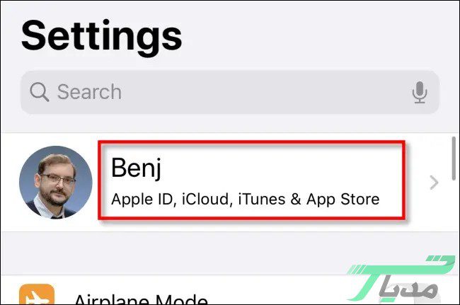 ۱- اگر بخواهید قابلیت Reading List را به صورت Offline فعال کنید نیاز دارید تا برخی تنظیمات در iCloud را ایجاد کنید. برای این کار ابتدا وارد تنظیما گوشی شوید و روی نام کاربری خود که بالای صفحه نمایش وجود دارد کلیک کنید.