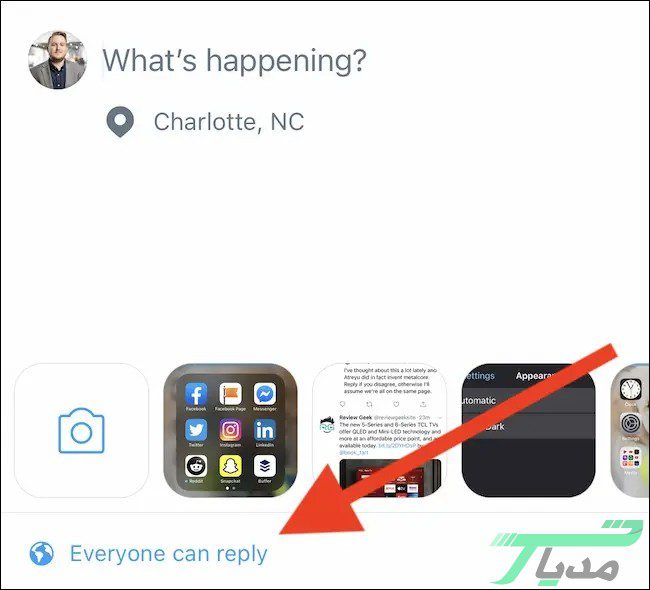 ۴- در این مرحله روی گزینه EveryOne Can Reply کلیک کنید تا افرادی را که برای ریپلای زدن میخواهید محدود کنید را انتخاب کنید.