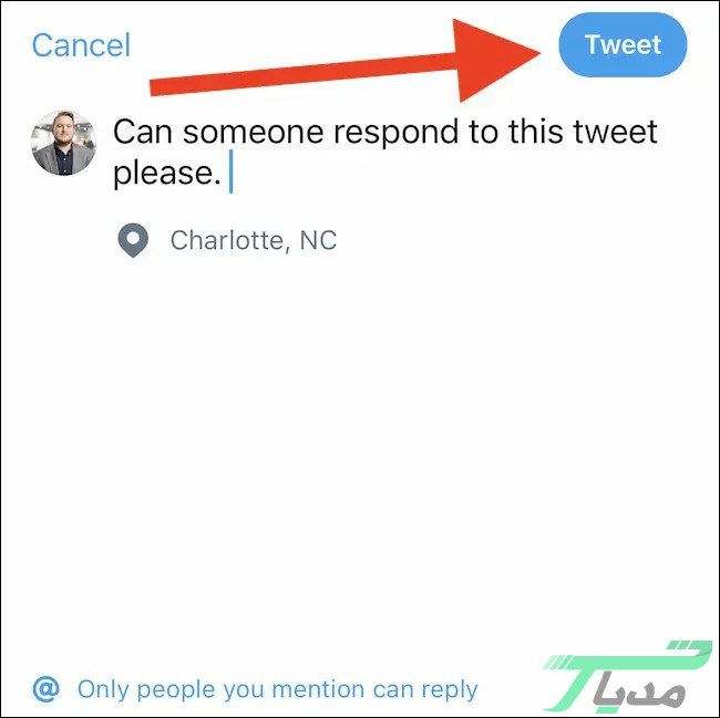 ۶- اگر در این شرایط نام هیچ کاربری را وارد نکنید، فردی جز شما نمیتواند توییتهای شما را ریپلای کند. اگر هنوز توییت خود را ایجاد نکردید بهتر است آن را بنویسید و روی گزینه Tweet کلیک کنید. شما میتوانید این مراحل را برای هر توییتی که پست میکنید انجام دهید. فقط همه این مراحل را برای هر پست باید طی کنید.