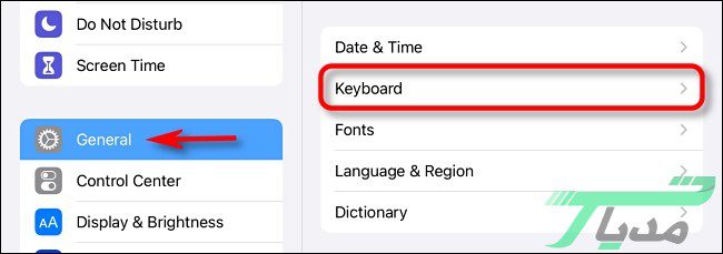 ۲- برای غیرفعال کردن این حالت ابتدا وارد تنظیمات (Setting ) یا تنظیمات آیپد شوید و پس از آن در بخش General روی گزینه Keyboard کلیک کنید.