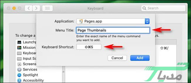 ۷- در این مرحله وارد صفحه میانبر شوید و نام دقیق اپلیکیشن موردنظر خود را در جعبه متنی که روبهروی گزینه Menu Title قرار دارد وارد کنید. سپس در جعبه متنی Keyboard Shortcut کلیدهای میانبری را که میخواهید وارد کنید. در مثال از 3 کلید Shift+Command+K استفاده شده است. علاوه بر آن میتوانید از هر ترکیب کلیدها استفاده کنید؛ حتی از کلیدهای اعداد، کنترلی و دستوری نیز میتوانید به عنوان کلیدهای میانبر استفاده کنید.
