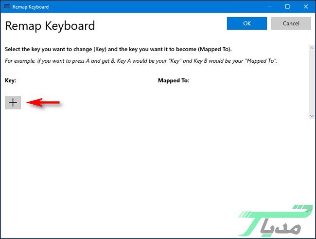 ۲- در این مرحله پنجرهای به نام Remap Keyboard برای شما باز میشود که باید روی گزینه + کلیک کنید و یک کلید و کار جدید انتخاب کنید. برای مثال اگر میخواهید کلید Page Down برای شما کار ویندوز را انجام دهد ابتدا کلید Page Down را به عنوان Key و Win را به عنوان Mapping انتخاب کنید. سعی کنید کلیدی را انتخاب کنید که از آن زیاد استفاده نمیکنید.