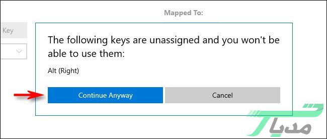 ۴- در این مرحله باید روی گزینه ok کلیک کنید. ممکن است پیامی مبتنی بر اینکه شما کار جدیدی را به کلیدهای کیبورد اضافه کردید مشاهده کنید. در این صورت باید روی گزینه Continue Anyway کلیک کنید.