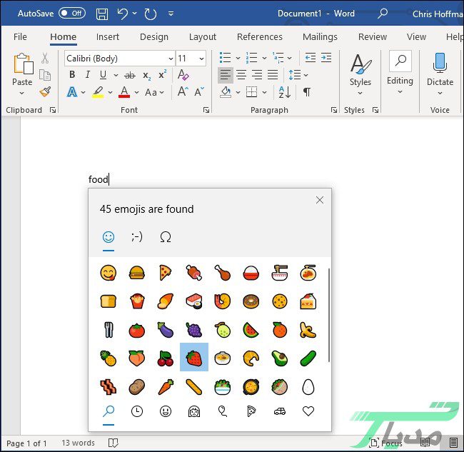 فایل ورد۲- با تایپ کردن نام ایموجی در هر دو سیستم عامل ویندوز و مک می‌توانید به ایموجی دلخواه خود دسترسی داشته باشید. برای مثال اگر عبارت Food را تایپ کنید می‌توانید ایموجی‌هایی که به غذا مربوط می‌شوند را مشاهده کنید. اگر می‌خواهید ایموجی دلخواه خود را در متن وارد کنید می‌توانید روی ایموجی کلیک کنید یا از کلیدهای جهت‌نما و کلید Enter استفاده کنید.