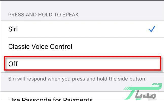 ۴- در تنظیمات مربوط به دکمههای گفته شده و در بخش Press and Hold To Speak روی گزینه Off کلیک کنید. زمانی که این مراحل را انجام دادید سرویس دستیار صوتی Siri با فشار دادن دکمه Home دکمه کناری گوشی فعال نخواهد شد. البته توجه داشته باشید که هر زمانی که بخواهید میتوانید با استفاده از فرمان صوتی Hey Siri دستیار صوتی Siri را فعال کنید.