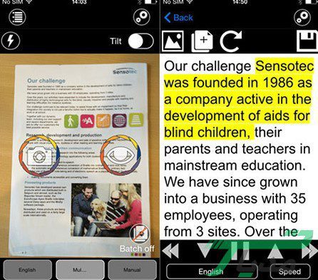 اپلیکیشن ویژه خواندن متن با صدای بلند که به آن KNFB نیز میگویند میتواند با استفاده از حسگرهای بسیار قدرتمند خود، یک متن چاپی را با صدای بلند برای افراد کمبینا و نابینا بخواند. این افراد فقط با استفاده از یک دکمه روی دستگاه خود میتوانند متن یک یا چند صفحهای را مطالعه کنند.