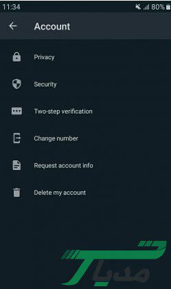 ۱- ابتدا پیامرسان واتساپ را باز کنید، روی سه نقطه بالای آن ضربه بزنید. سپس گزینه Setting را انتخاب کنید تا وارد تنظیمات این پیامرسان شوید. سپس روی گزینه Account ضربه بزنید.