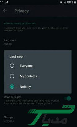 ۳- در بخش Privacy میتوانید چند گزینه را مشاهده کنید. در این شرایط روی گزینه About ضربه بزتید و حالت آن را از Everyone به Nobody تغییر دهید. زمانی که این مراحل را به صورت کامل انجام میدهید، شمارههمراه شما در واتساپ مخفی میشود و سایر افراد نمیتوانند آن را ببینند. در این حالت میتوانید با خیال راحت در گروههای مختلف عضو شوید و به افراد ناشناس پیام ارسال کنید.