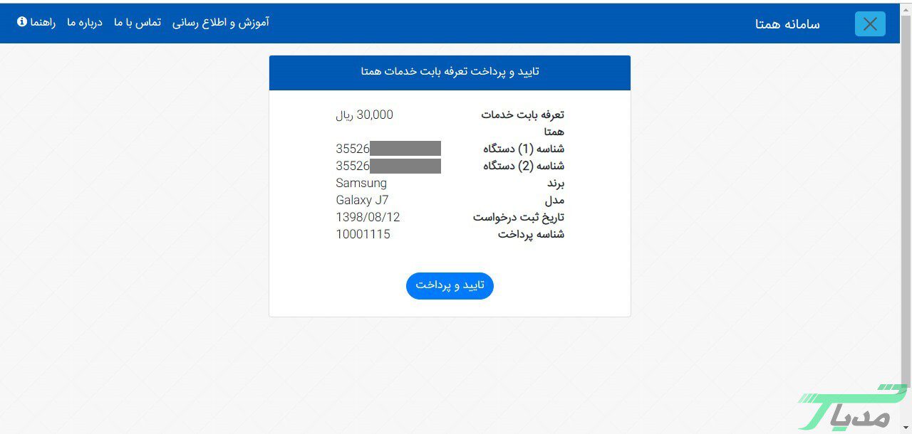 ۲- در این مرحله میتوانید وارد صفحه اطلاعات دستگاه خود شوید. اگر همه اطلاعات صحیح بود باید روی گزینه تایید و پرداخت کلیک کنید. توجه داشته باشید که اگر روی لینکی در پیامک همتا به شما ارسال میکند کلیک کنید نیز میتوانید به صورت مستقیم وارد این صفحه شوید.