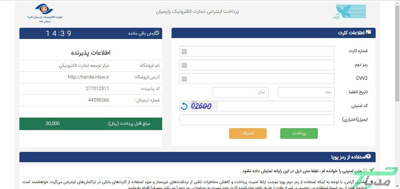 ۳- پس از اینکه وارد صفحه پرداخت شدید باید اطلاعات مربوط به یکی از کارتهای بانکی عضو شتاب خود را همراه با کد امنیتی که نشان داده میشود وارد کنید. پس از آن نیز روی گزینه پرداخت کلیک کنید.در حقیقت زمانی که اطلاعات از گمرک به همتا ارسال شد یک پیامک برای پرداخت مبلغ 3074 تومان (بابت خدمات همتا) به شماره سیمکارت وارد شده ارسال میشود. در این مرحله نیز میتوانید روی لینک کلیک کنید و مبلغ را پرداخت کنید.