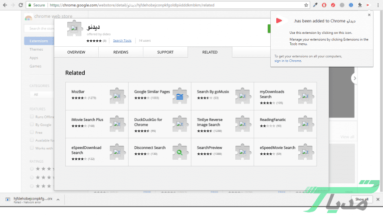 یوتیوب۳- برای رفع این مشکل می‌توانید از فیلترشکن استفاده کنید. در هر صورت زمانی که مشکل فیلترشدن برطرف شد می‌توانید به فرآیند نصب ادامه دهید. زمانی که روی گزینه ADD TO CHROME، کلیک کردید به منظور نصب افزونه دیدئو از شما درخواست اجازه می‌شود که باید روی گزینه Add Extension کلیک کنید. پس از آن نیز افزونه روی مرورگر کروم شما نصب خواهد شد.