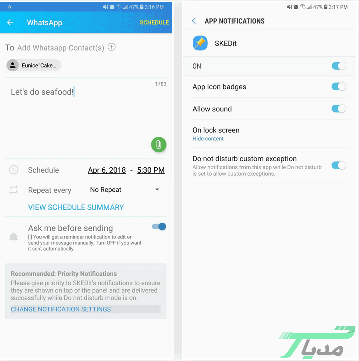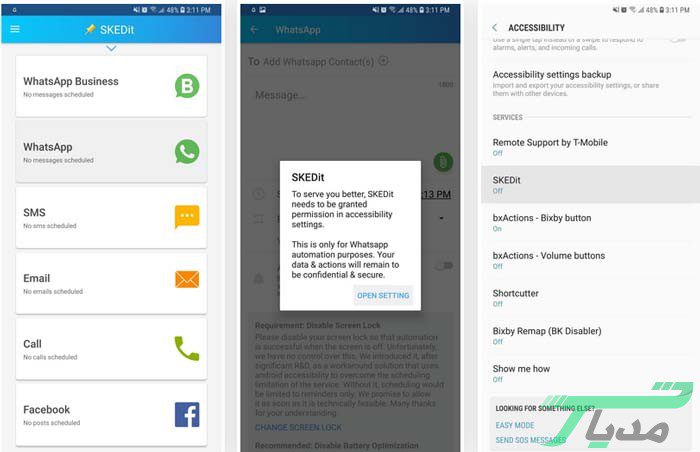 برنامه SKEDit یک برنامه اندرویدی است که به کاربران این امکان را میدهد تا در زمان ارسال پست و پیامهای خود را در پیام رسان واتساپ تنظیم کنند. استفاده از این اپلیکیشن یک روش خوب برای ارسال پیام به دوستان و همکاران در زمان مناسب است.