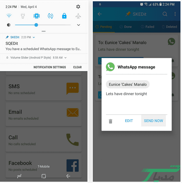 ۸- اگر تصمیم داشتید از روش دستی استفاده کنید، نیازی نیست کار سختی انجام دهید. فقط مقداری منتظر بمانید و پیامی که برای ارسال آن برنامهریزی کردید را فراموش نکنید. زمانی که نوبت به ارسال پیام رسید اعلانی از SKEDit دریافت میکنید که از شما خواسته میشود پیام را ارسال کنید. فقط بهتر است روی این اعلان ضربه بزنید و گزینه Send یا ارسال که روی پنجره قرار دارد انتخاب کنید تا پیامی که در گذشته نوشتید را برای مخاطب خود ارسال کنید. همچنین می توانید پیام خود را در لحظه آخر ویرایش یا حذف کنید.