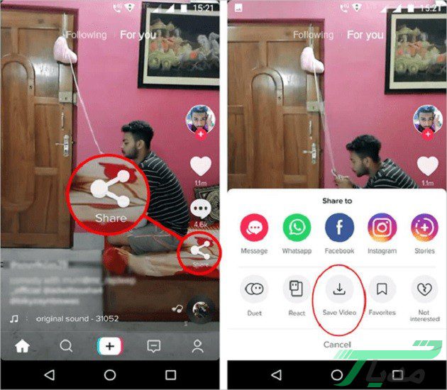 در حالت عادی برای دانلود ویدیوهای کاربران ابتدا ویدیو مورد نظر را باز کنید. سپس نماد فلش را در بخش سمت راست صفحه انتخاب کنید و گزینه Save video را انتخاب کنید. با این کار میتوانید فیلم کوتاه مورد نظر خود را در گالری گوشی خود ذخیره کنید. اگر گزینه ذخیره ویدیو را پیدا نکردید کاربر مورد نظر امکان دانلود ویدیوهای خود را بسته است.