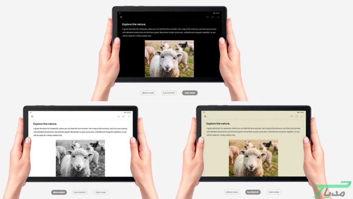 همچنین امکان نمایش تصویر در حالت تاریکی (Dark Mode) نیز وجود دارد که با تیره کردن قسمتهای زیادی از تصویر، جلوی تابش زیاد نور را میگیرد. این قابلیت به خصوص در مطالعه هنگام شب بسیار کارآمد است.