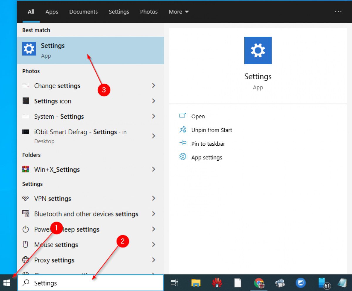 ابتدا وارد تنظیمات ویندوز یعنی Settings شوید. برای این کار ابتدا کلید ویندوز را روی صفحه‌کلید زده و سپس عبارت Settings را بنویسید و از لیست نتایج ظاهر شده روی Settings کلیک کنید.