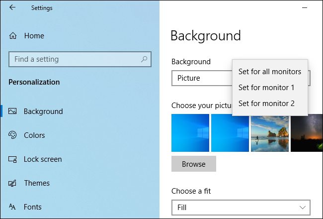 بعد از این به بخش Background مراجعه و در قسمت Choose Your Picture روی تصویر پس‌زمینه موجود کلیک راست کرده و گزینه Set For Monitor 1 برای قرار دادن تصویر برای مانیتور اول، گزینه Set For Monitor 2 برای انتخاب تصویر پس زمینه مانیتور دوم انتخاب کنید. به تعداد مانیتور متصل شده می‌توان تصاویر پس‌زمینه متفاوتی انتخاب کرد.