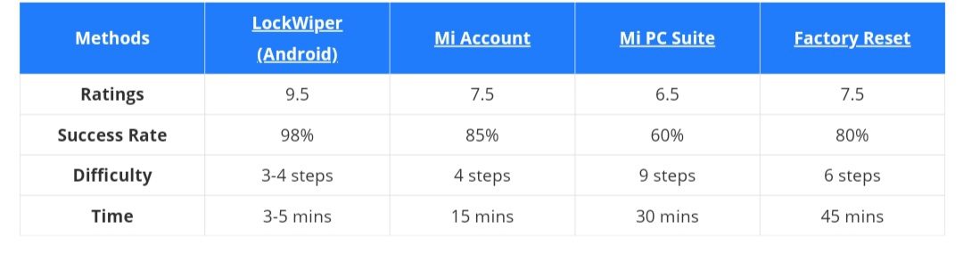 از جدول بالا مشخص است که انتخاب LockWiper سریع ترین و ساده ترین روش برای باز کردن قفل گوشی شیائومی شما است.
