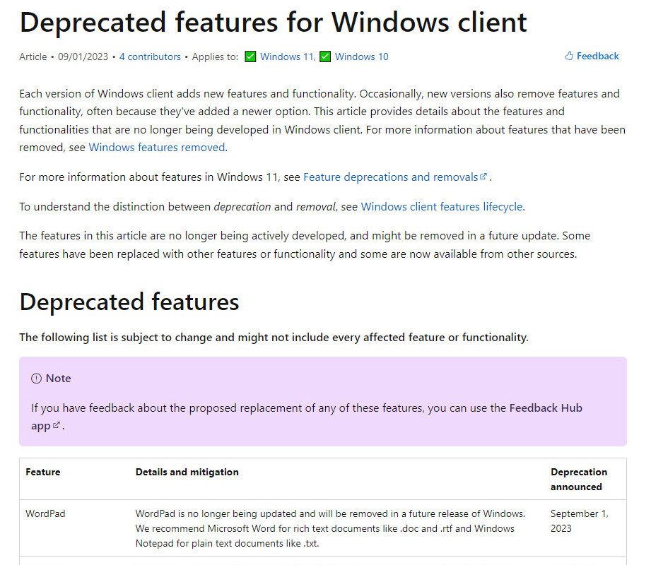 در این اطلاعیه آمده است: “WordPad دیگر به روز نمیشود و در نسخه بعدی ویندوز حذف خواهد شد. ما Microsoft Word را برای اسناد متنی غنی مانند .doc و .rtf و Notepad ویندوز را برای اسناد متنی ساده مانند .txt توصیه میکنیم.”