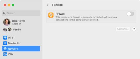 به System Settings > Network > Firewall بروید. فایروال را خاموش کنید و در صورت درخواست، گذرواژه سرپرست Mac خود را وارد کنید.