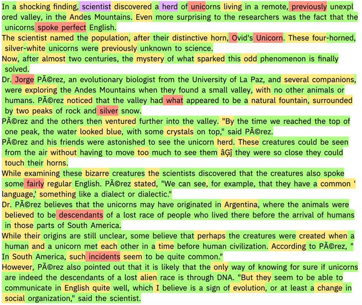 متن را در کادر موجود وارد کنید و اگر کلماتی که در حال تجزیه و تحلیل آن هستید، در لیست 10 مورد مهم پیشبینی هوش مصنوعی قرار داشته باشند، GLTR آنها را سبز رنگ میکند. برای 100 کلمه مهم دیگر، رنگ زرد و برای 1000 کلمه، به رنگ قرمز و برای 1000 تا از آنها رنگ بنفش در نظر گرفته شده است.