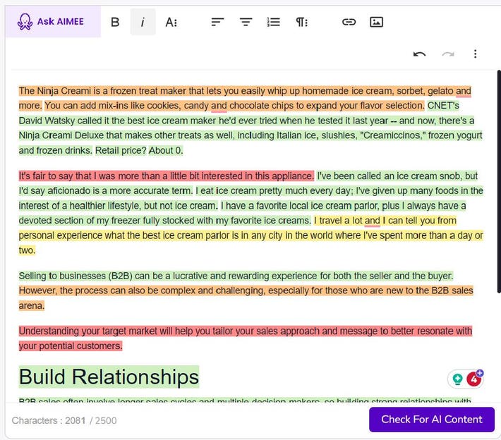 متن را در فیلد تایپ جایگذاری کنید تا با استفاده از هوش مصنوعی آن را بررسی کند. به گفته Sapling، این فرآیند پس از 50 کلمه دقیقتر میشود. بخش بالای پنجره نتایج، امتیاز کلی و بخشهای برجسته متن را که به نظر میرسد با هوش مصنوعی ایجاد شدهاند، نشان میدهد. بخش پایین جملاتی را که کلیشهای یا ساده هستند را علامتگذاری کرده و جدا میکند.
