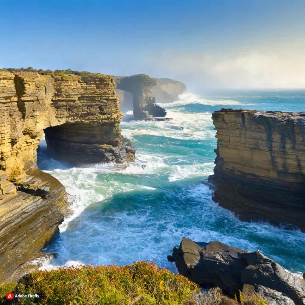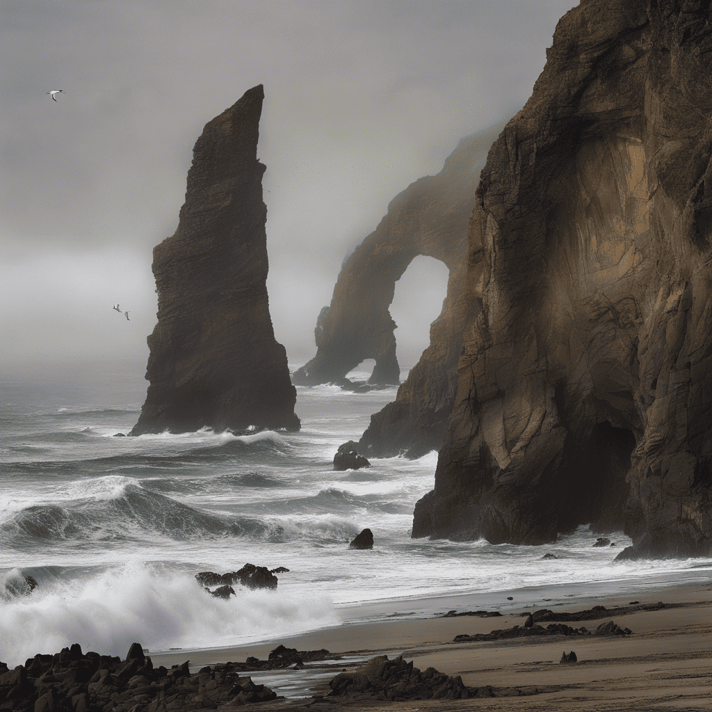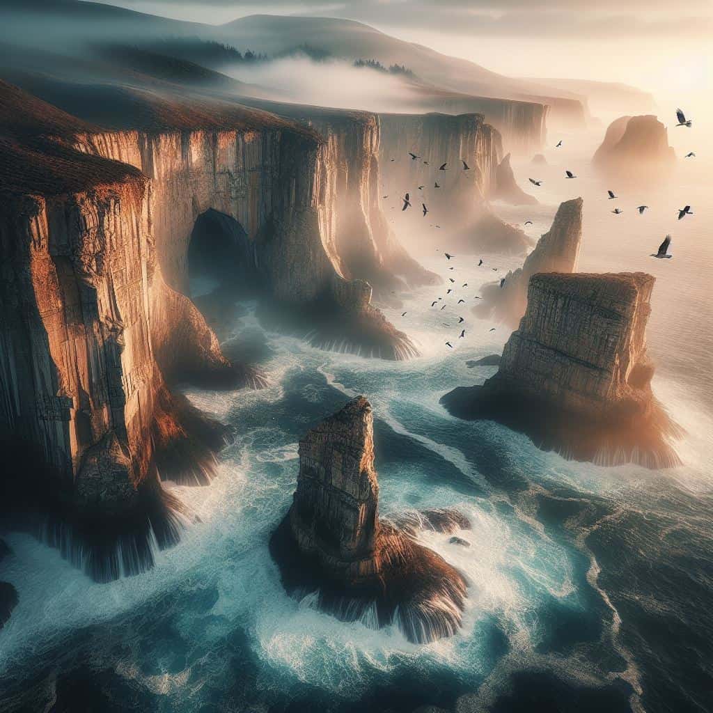 • موضوع: خط ساحلی ناهموار فرسایش یافته توسط امواج، صخره‌های سر به فلک کشیده در طاق های چشمگیر و حضور پرندگان دریایی که در  بالای دریا اوج می‌گیرند. همچنین مه در امتداد افق به چشم می‌خورد.