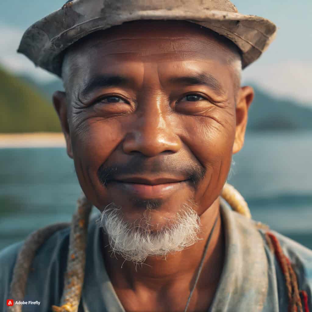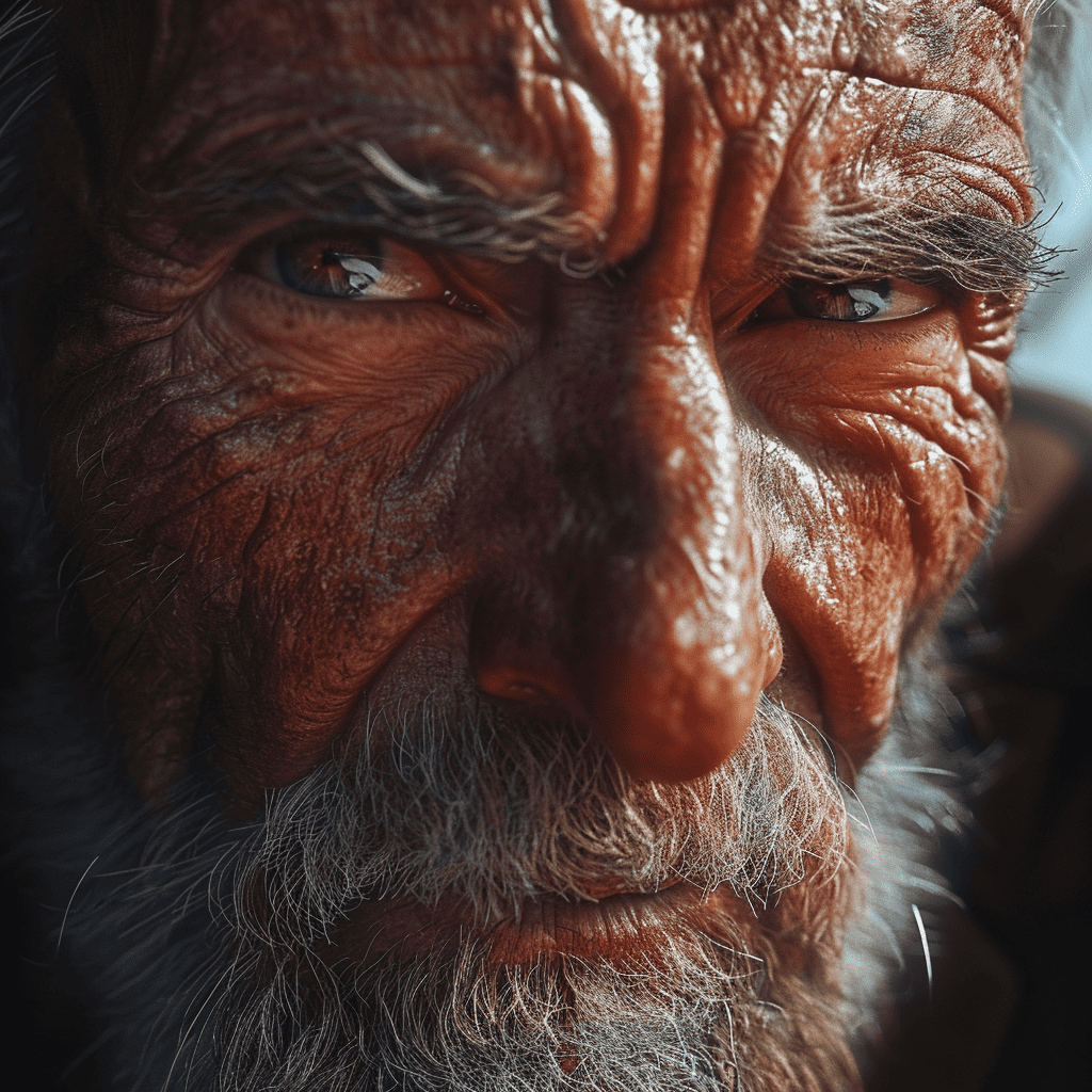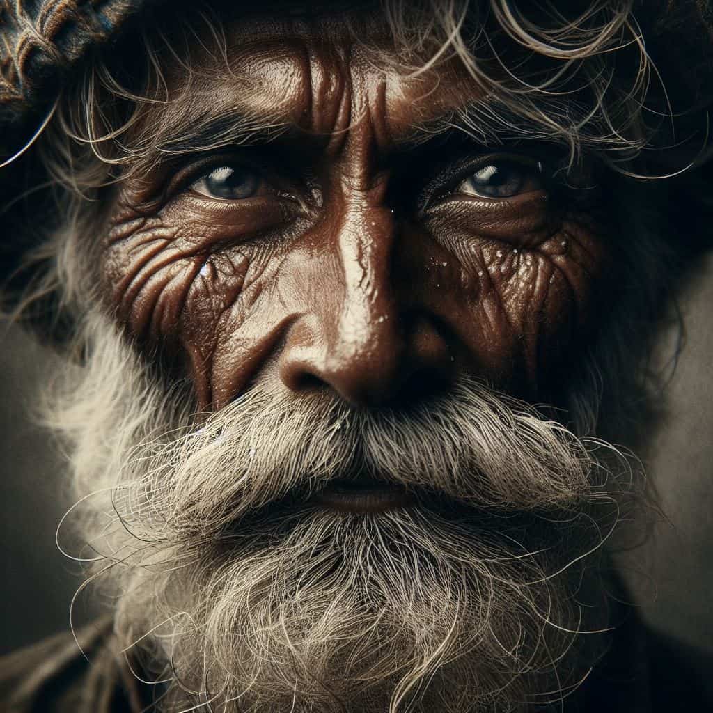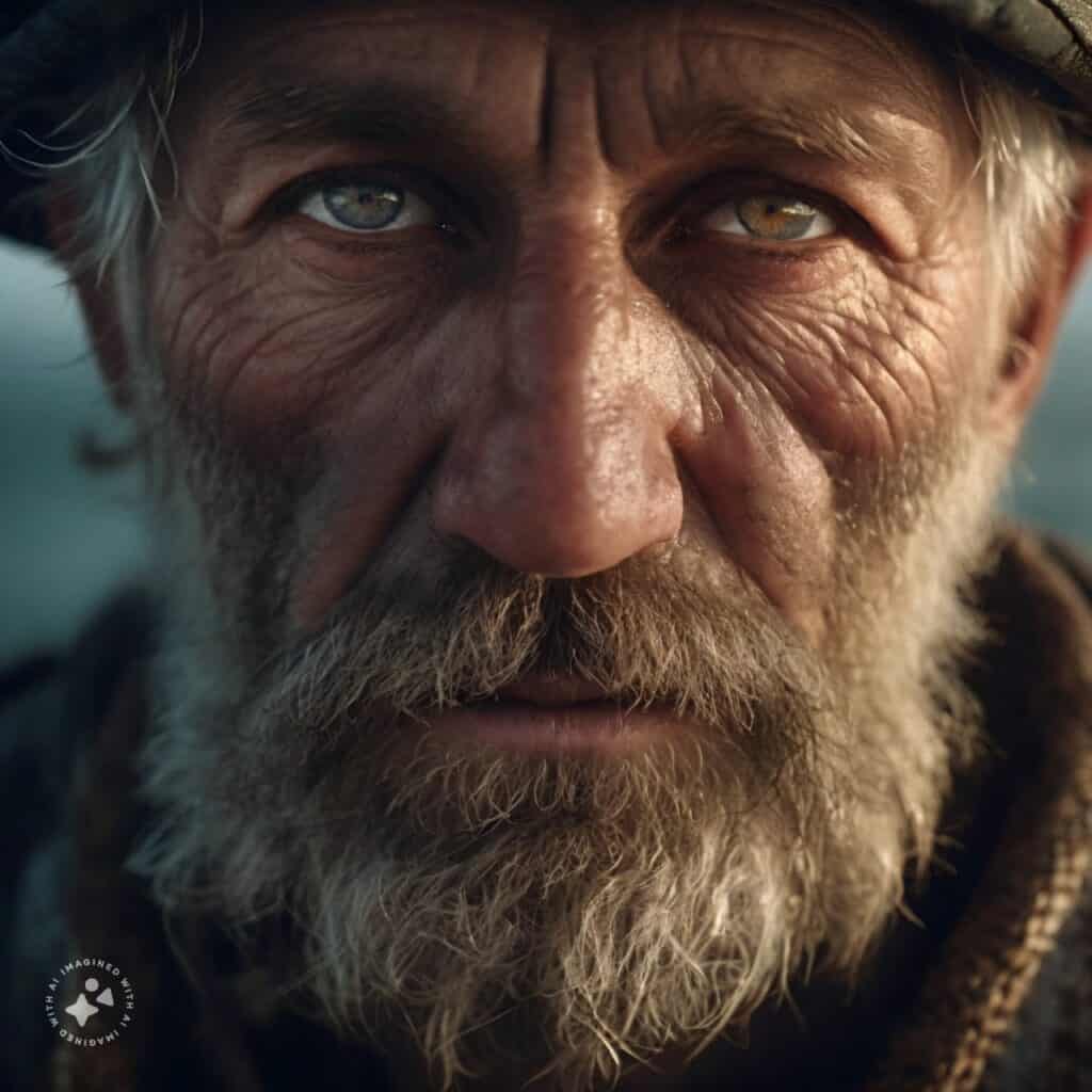 • موضوع: پرتره نزدیک از یک ماهیگیر با چین و چروک دور چشمانش و ریش سفید، همراه با نورپردازی سینمایی