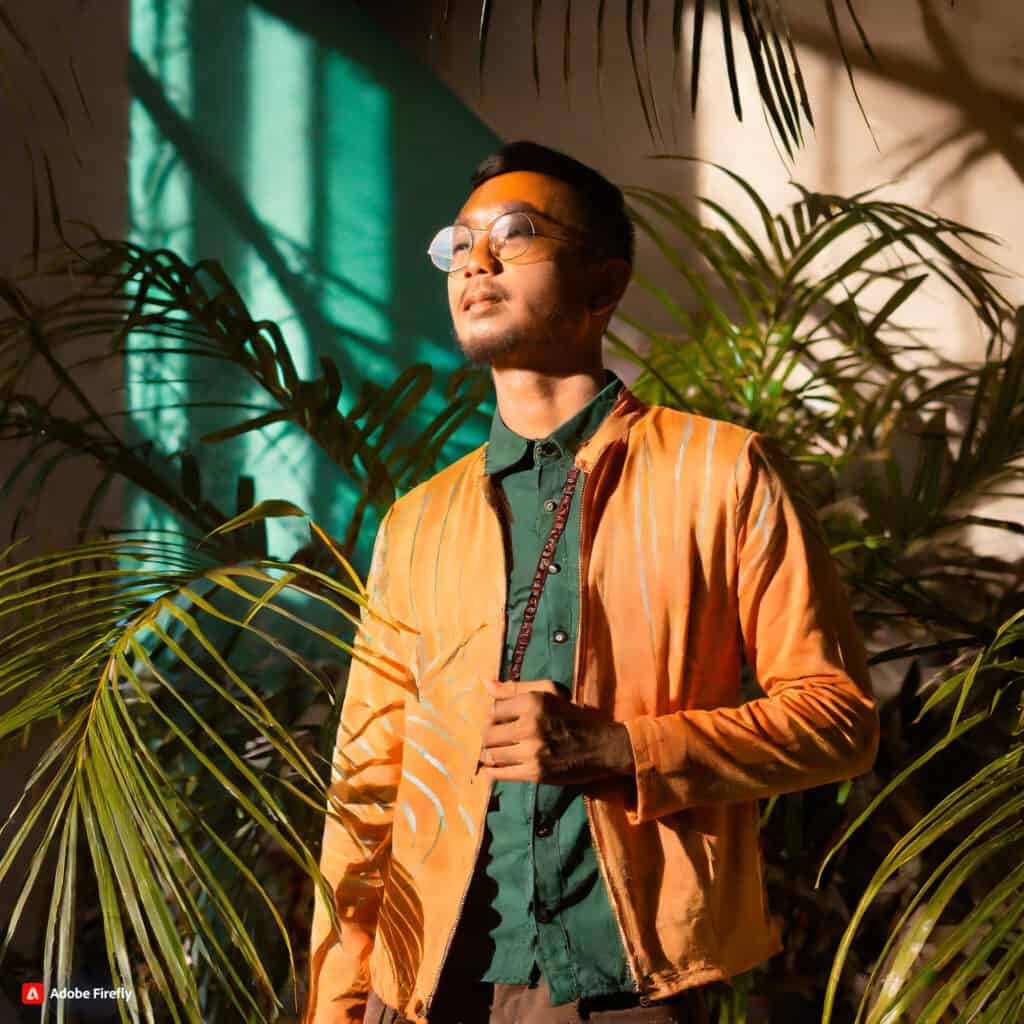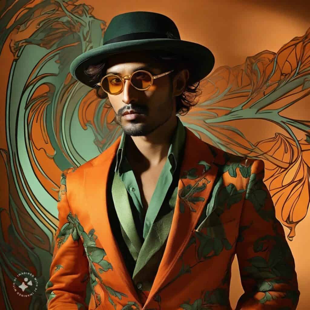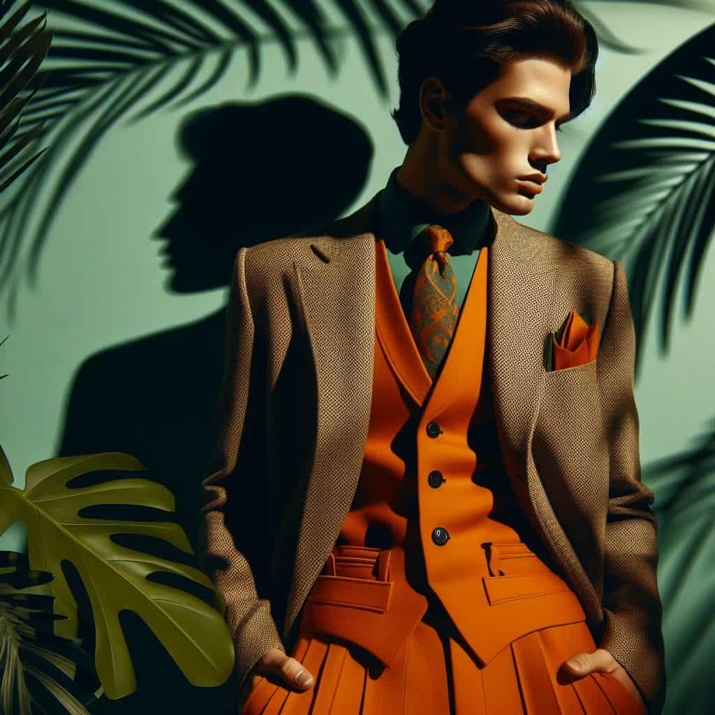 • موضوع: یک مرد شیک‌پوش با لباس‌های نارنجی و سبز با فیگورهای زیبا. عکاسی به سبک پست مدرن و حضور گیاهان در تصویر.