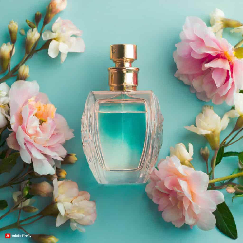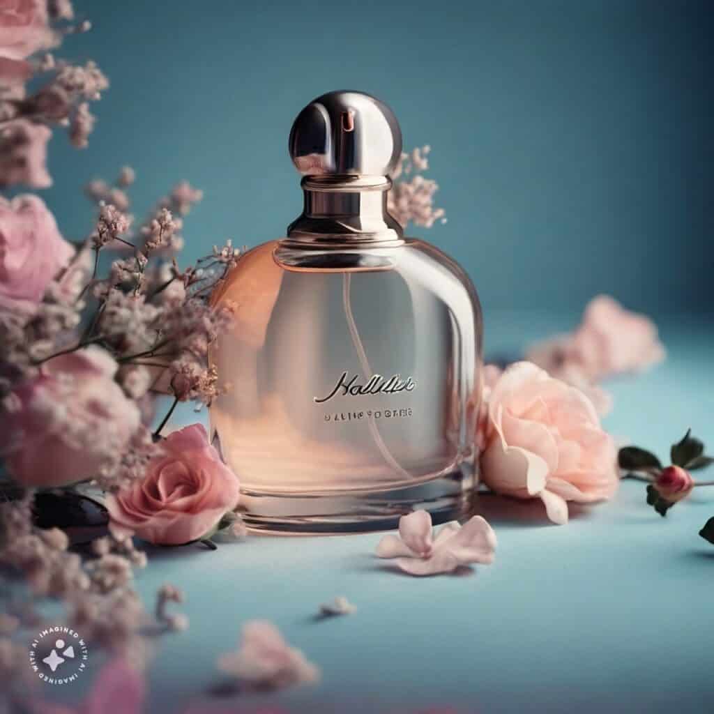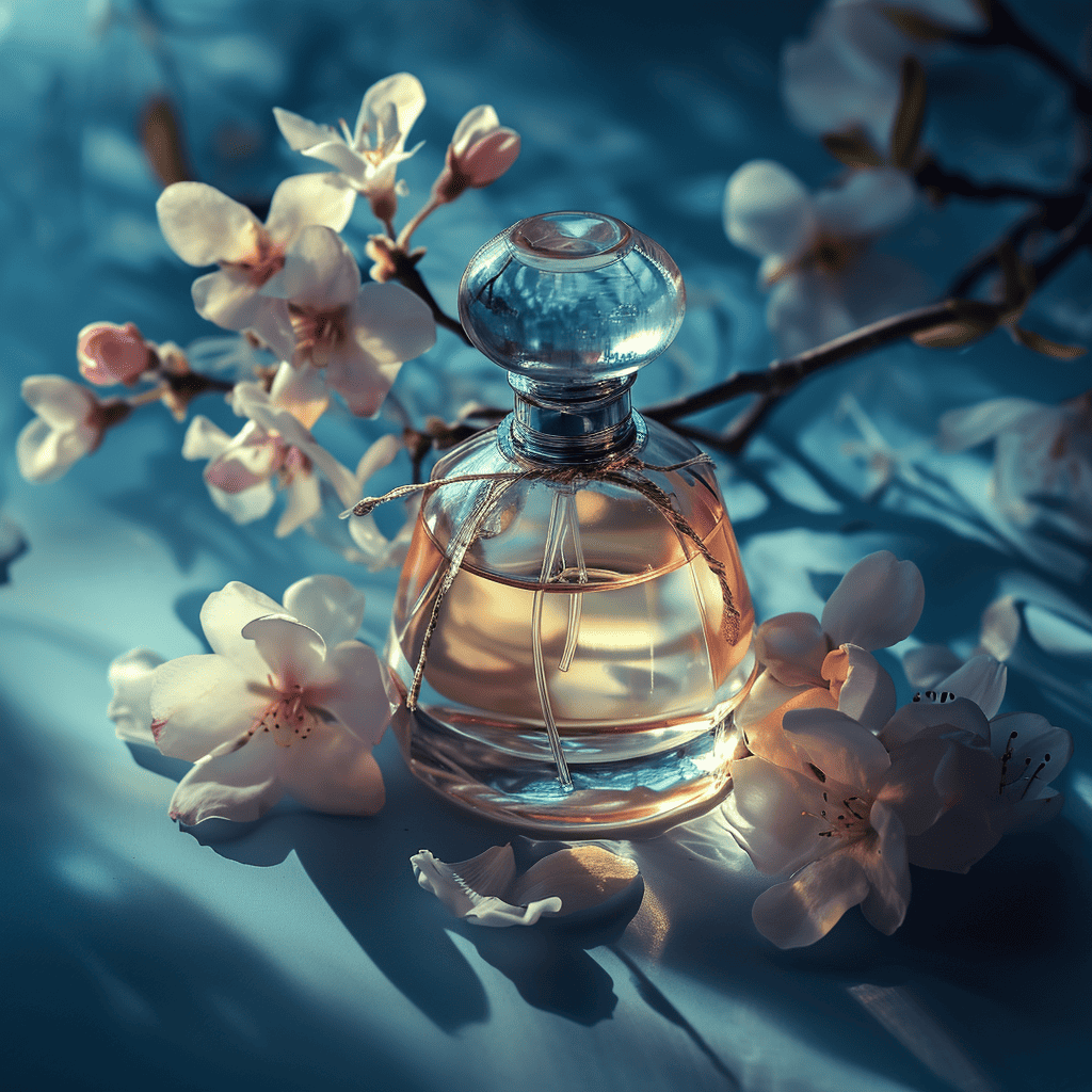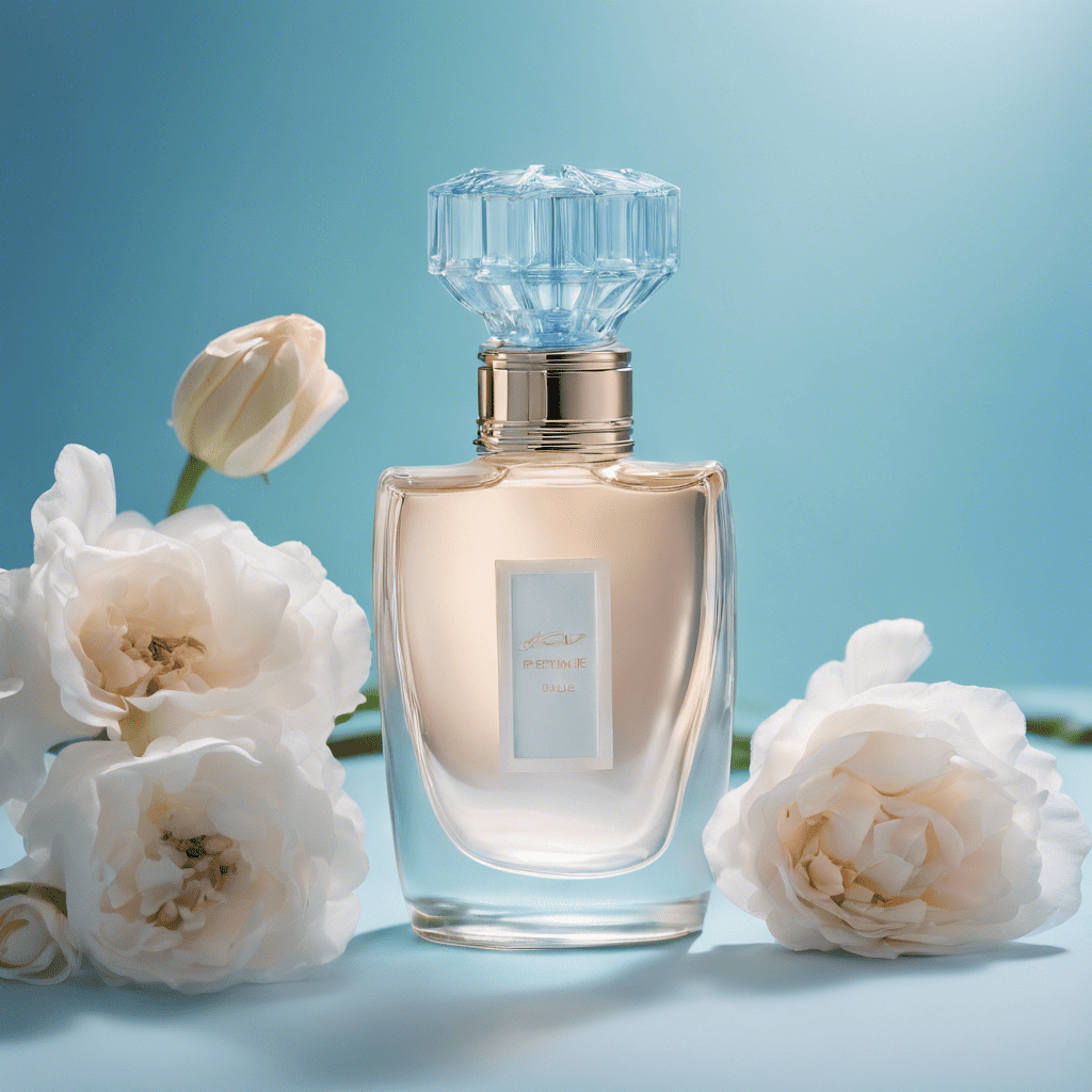 • موضوع: عکاسی تجاری برای شیشه عطر، با پس‌زمینه آبی پاستلی با نورپردازی ملایم و وجود گل