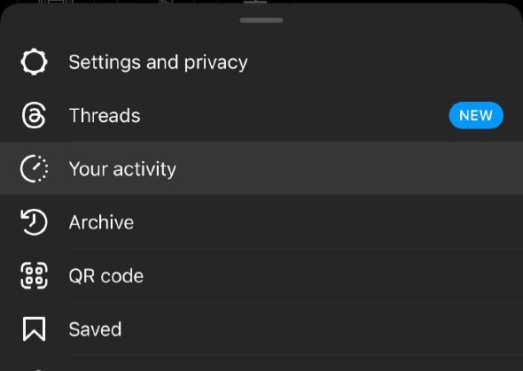 اینستاگرام را راه‌اندازی کنید و روی نماد نمایه در گوشه سمت راست پایین ضربه بزنید. روی سه خط در گوشه بالا سمت راست ضربه بزنید و Your activity را از منوی pop-up انتخاب کنید.