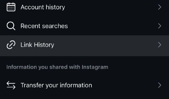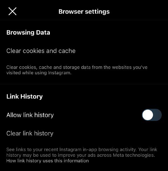 همچنین گزینه پاک کردن سابقه پیوند خود را در همان منو خواهید یافت. اما با غیرفعال کردن این ویژگی، تمام لینک‌هایی که اخیراً از اینستاگرام بازدید کرده‌اید نیز پاک می‌شود.