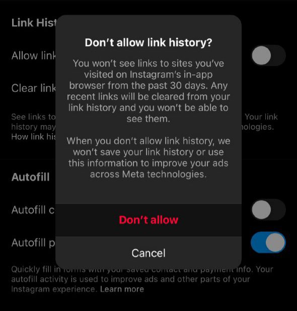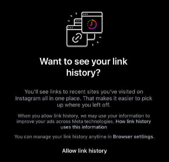 اینستاگرام برای ردیابی همه پیوندهایی که در برنامه روی آنها ضربه می‌زنید و بازدید می‌کنید، به اجازه شما نیاز دارد. با این حال، ممکن است یک پنجره ببینید که از شما می‌خواهد ویژگی تاریخچه پیوند را هنگام استفاده از پلتفرم فعال کنید.