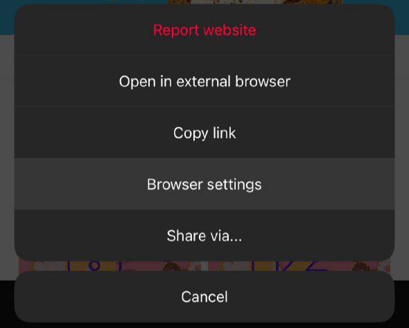 همچنین ممکن است “No recent link history” را در این منو ببینید، به این معنی که هنوز روی هیچ پیوند خارجی در پلتفرم ضربه نزده‌اید. سپس، روی دکمه بیضی (…) در گوشه سمت راست بالای مرورگر ضربه بزنید و Browser settings را انتخاب کنید.