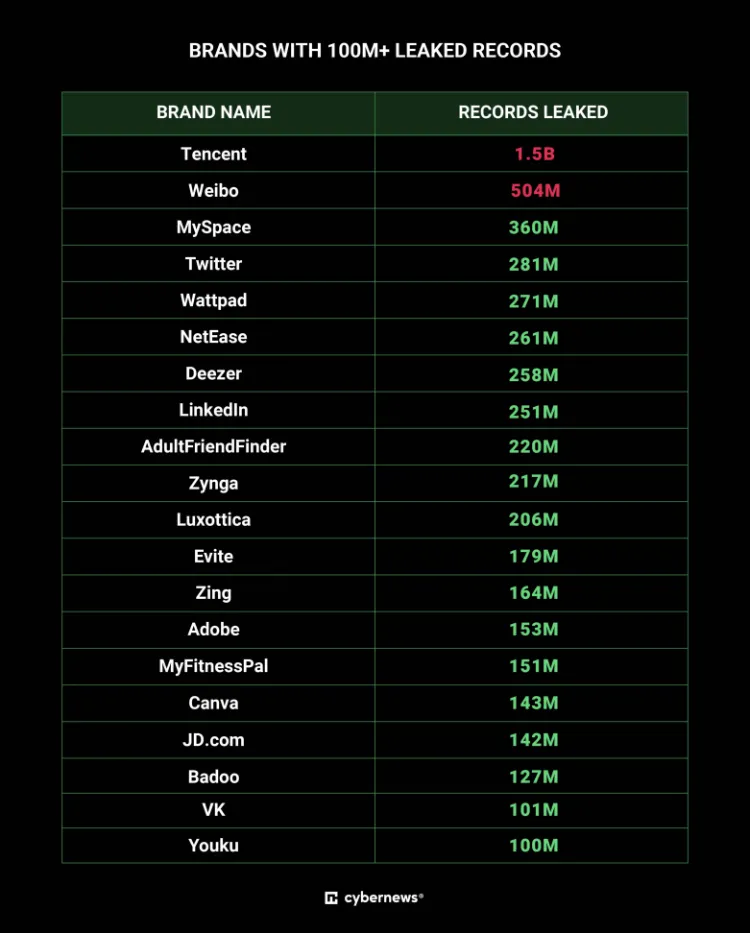 درحالیکه سرویس میزبانی فایل دراپباکس شاهد 69 میلیون سند فاش شده بود، پلتفرمهای QQ و ویبو از شرکت چینی تنست بهترتیب افشای 1.4 میلیارد و 504 میلیون سند را تجربه کردند. برخی دیگر از مهمترین سرویسها عبارتاند از: ادوبی با 153 میلیون و تلگرام با 41 میلیون و Canva با 143 میلیون سند فاششده.