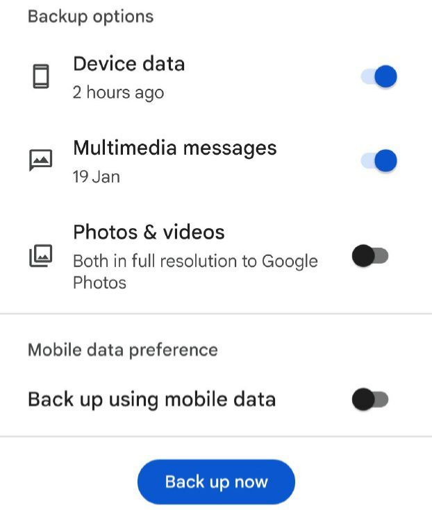 Google One به شما امکان می‌دهد تنظیمات دستگاه، گزارش تماس‌ها، مخاطبین، پیام‌ها و داده‌های برنامه مانند گذرواژه‌ها را بازیابی کنید. برنامه Google One را در دستگاه قدیمی خود نصب و باز کنید و با حساب Google خود وارد شوید. اکنون، روی نماد منو ضربه بزنید و به Settings > Manage backup settings بروید. داده‌های دستگاه و هر گزینه دیگری که ممکن است نیاز داشته باشید را روشن کنید و روی Backup now ضربه بزنید.