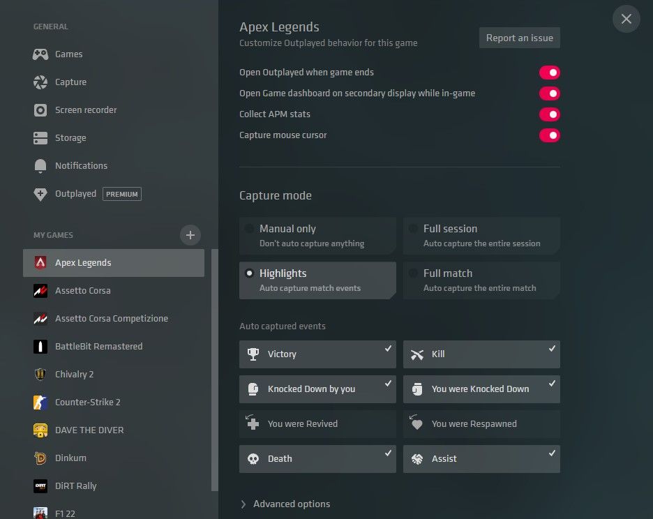 اگر Outplayed قبلاً بازی موردنظر را شناسایی نکرده باشد، می‌توانید تنظیمات را بررسی کنید و روی دکمه + کلیک کنید و بازی خود را جستجو کنید. اگر روی بازی‌تان در فهرست My Games کلیک کردید و مشاهده کردید Outplayed از آن برای بازی پشتیبانی می‌کند، باید بخش رویدادهای ضبط‌شده خودکار هم داشته باشد. به عنوان مثال، بازی Apex Legends دارای هشت رویداد است که می‌توانند ضبط خودکار را فعال کنند.