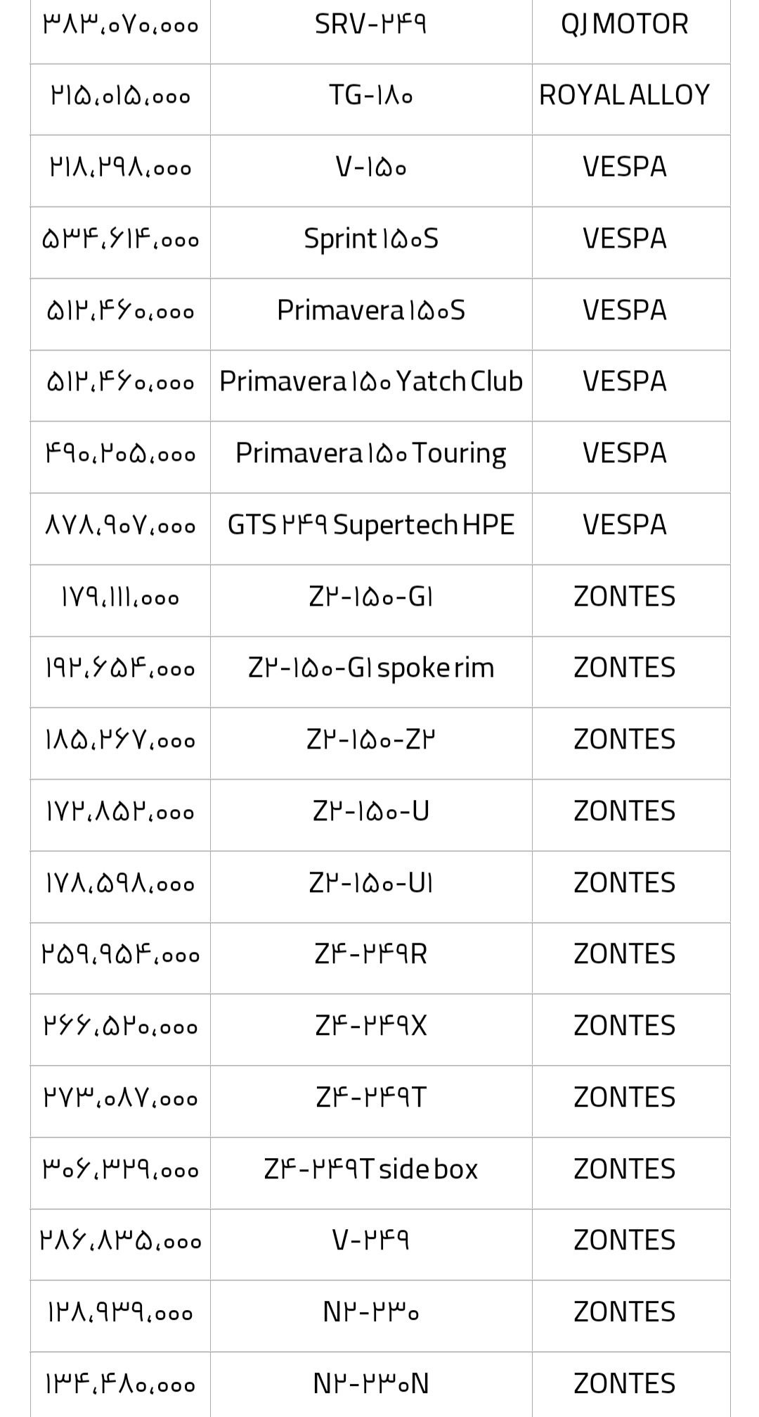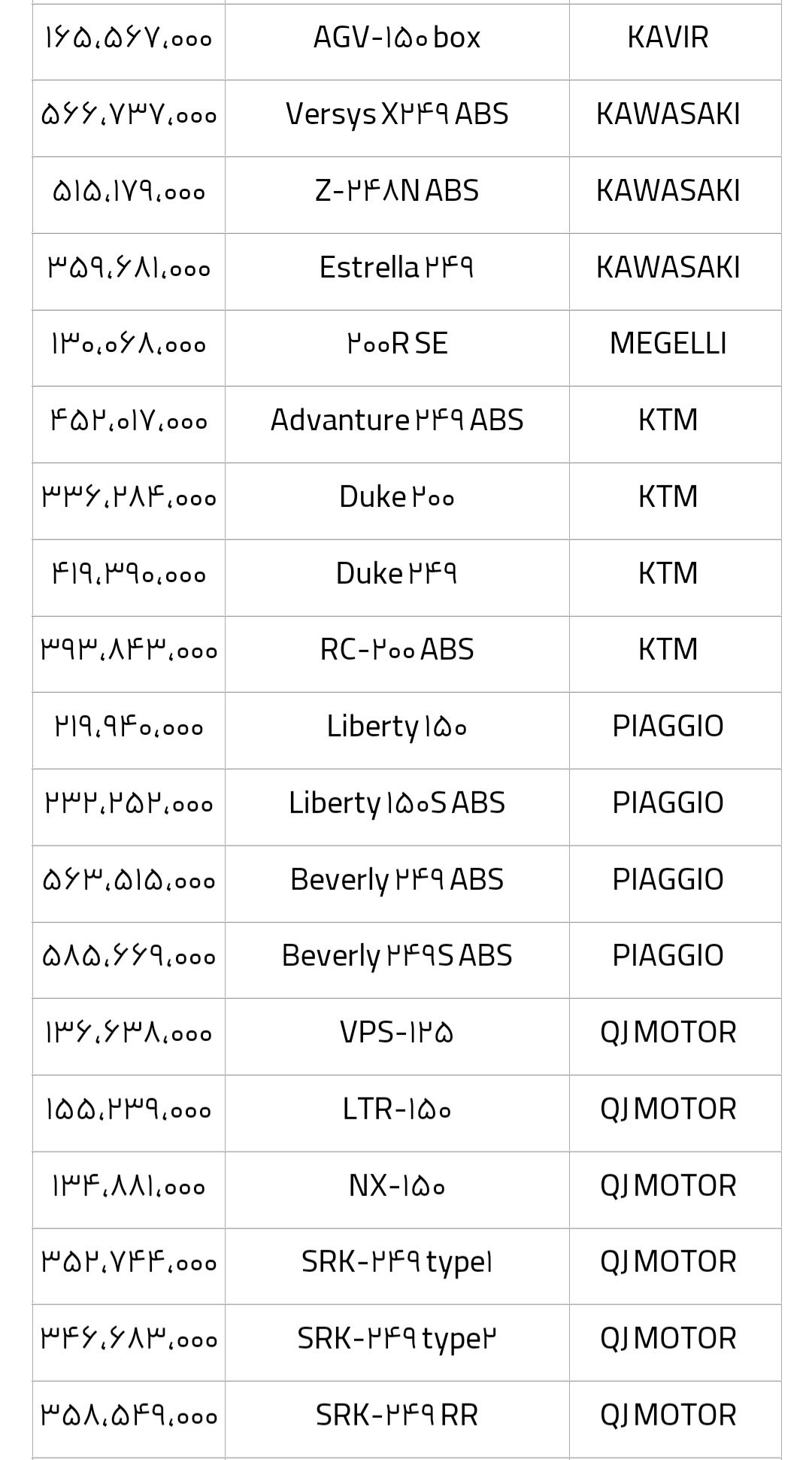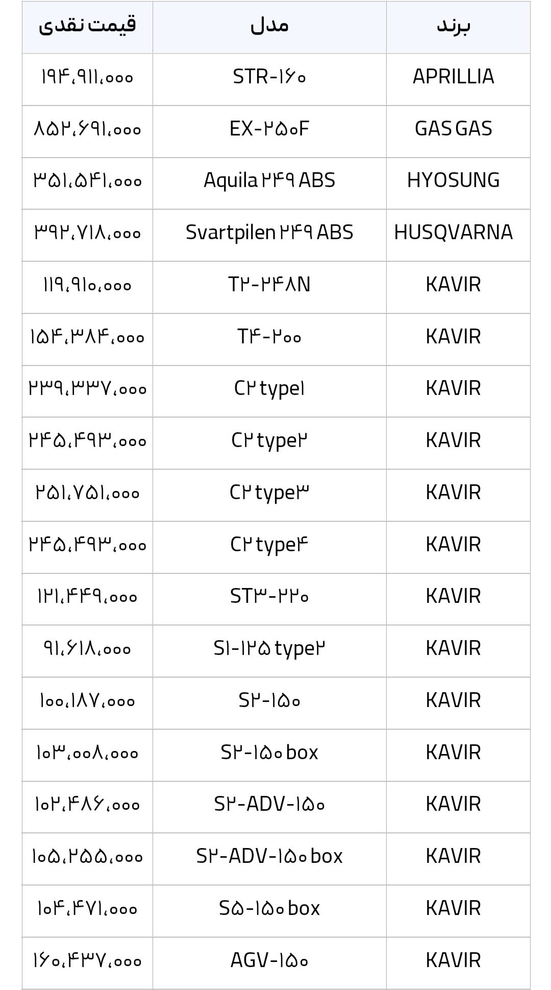 آخرین لیست قیمت محصولات کویر موتور نیز مطابق جداول زیر خواهد بود: