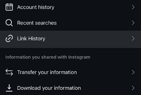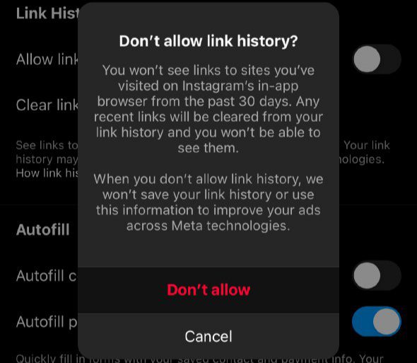 همچنین گزینه clear your link history را در همان منو خواهید یافت. اما با غیرفعال کردن این ویژگی، تمام لینک‌هایی که اخیراً از اینستاگرام بازدید کرده‌اید نیز پاک می‌شوند.