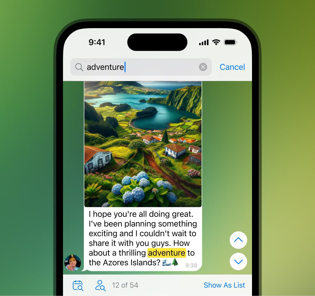 تلگرام جستجو را در همه چتها بهبود بخشیده و اکنون پیمایش در نتایج جستجو و مشاهده آنها بهعنوان یک فهرست فشرده آسانتر است. شاید لازم باشد بدانید که سریعترین راه برای باز کردن جستجو در هر چت، ضربه زدن و نگه داشتن عنوان آن است.