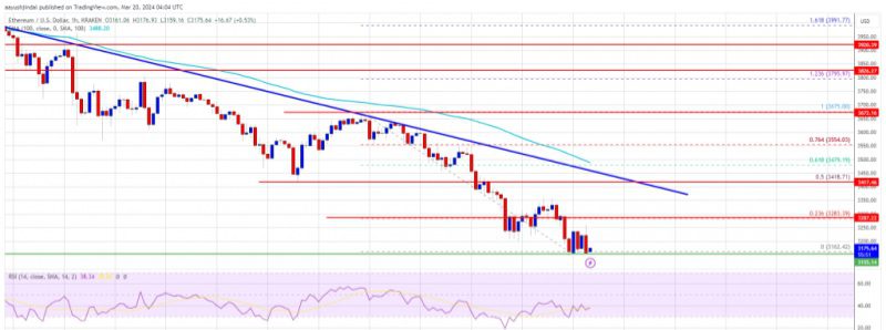 قیمت اتریوم مانند بیت‌کوین (BTC) در یک منطقه نزولی کوتاه‌مدت زیر سطوح 3550 و 3500 دلار باقی ماند. آلت‌کوین مذکور به زیر سطح حمایت 3350 دلار اُفت پیدا کرد تا در یک منطقه نزولی کوتاه‌مدت حرکت کند. درنهایت، قیمت زیر محدوده حمایت 3200 دلار معامله شد. در حال حاضر، پایین‌ترین قیمت در 3162 دلار تشکیل شده و قیمت درحال تثبیت زیان است.