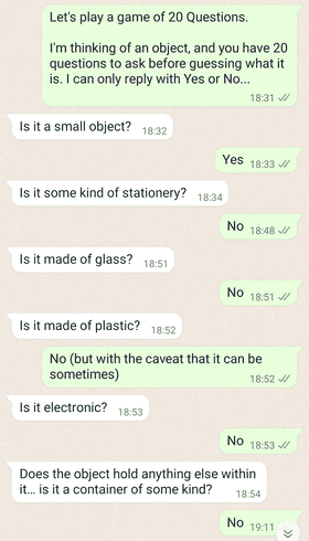 یکی از شما به یک شی یا شخص فکر میکند، در حالی که دیگری از طریق پیام درباره آن سؤال میکند. پاسخهای «بله/خیر» شما به فرد کمک میکند تا احتمالات را محدود کند تا زمانی که بتواند حدس بزند که دقیقاً به چه چیزی فکر میکردید.